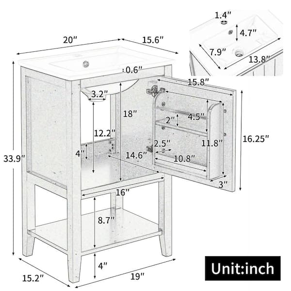 20 in. W x 15.5 in. D x 33.5 in. H Single Sink Bath Vanity in White with White Ceramic Top, and Open Shelf