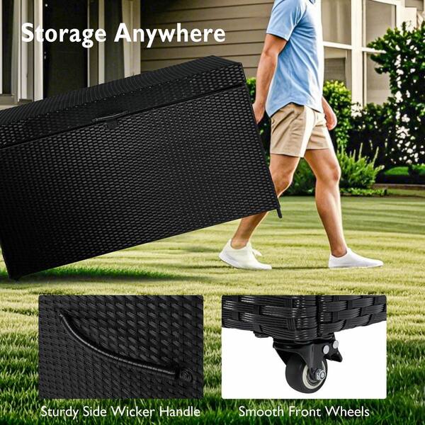 200 gal. Black Wicker Deck Box with Lockable Wheels, Outdoor Storage Box with Handle