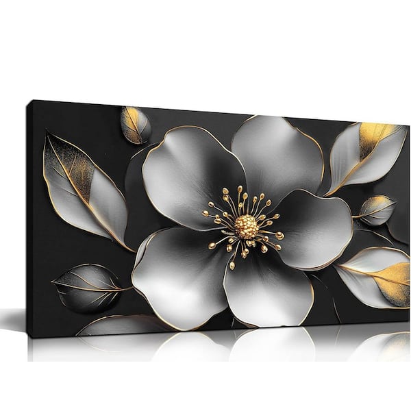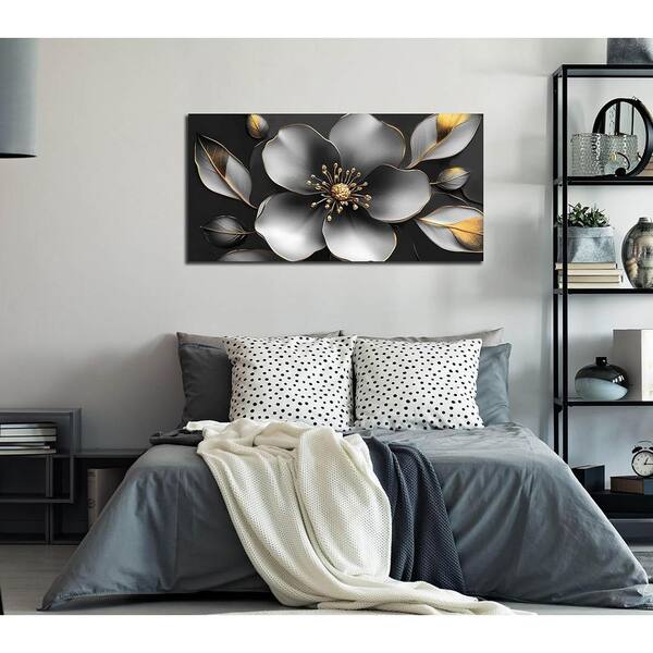 20x40 Large Framed Grey Metal-Tone Flower Canvas Wall Art - Modern Decor for Living Room, Bedroom and Office