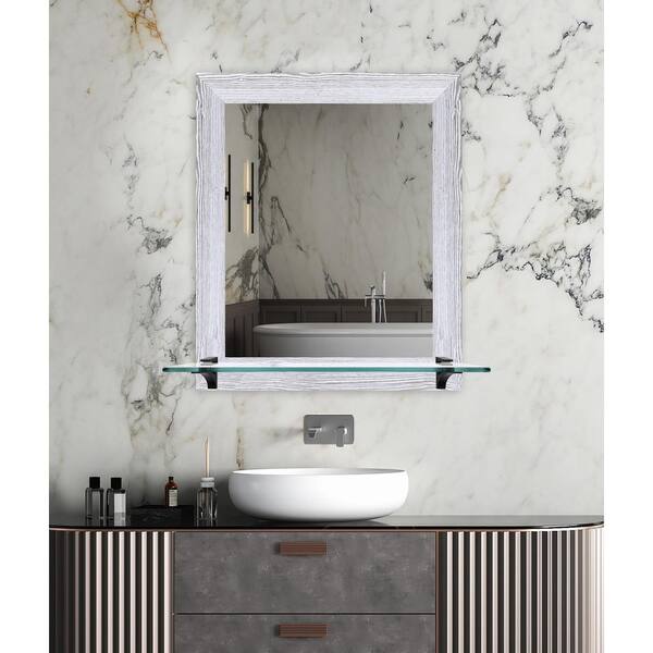 21.5 in. W x 25.5 in. H Rectangle Distressed White Vertical Framed Mirror With Tempered Glass Shelf/Black Bracket
