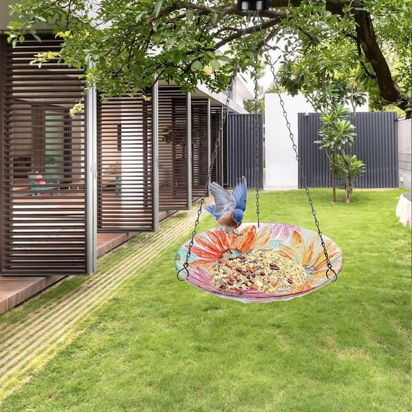 21 in. H x 11 in. Dia Flower Glass Birdbath with Rust-Proof Chain