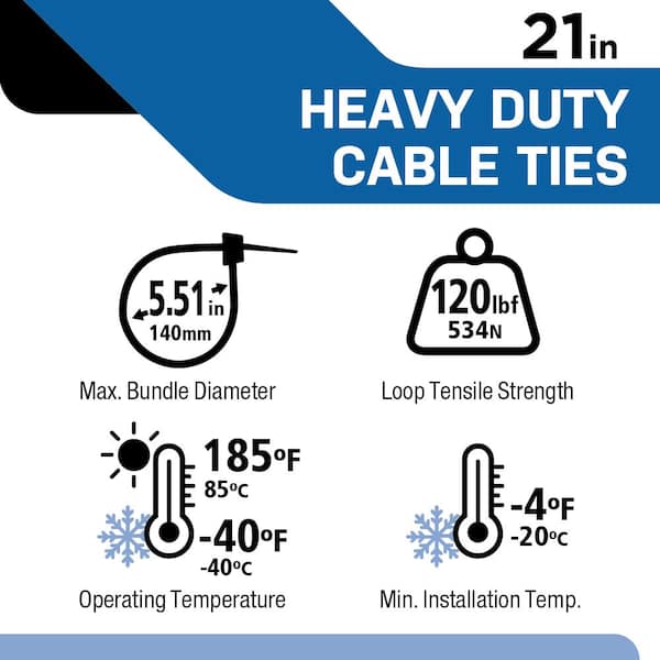 • 21" Commercial grade cable zip tie. Heavy duty use. UL-certified