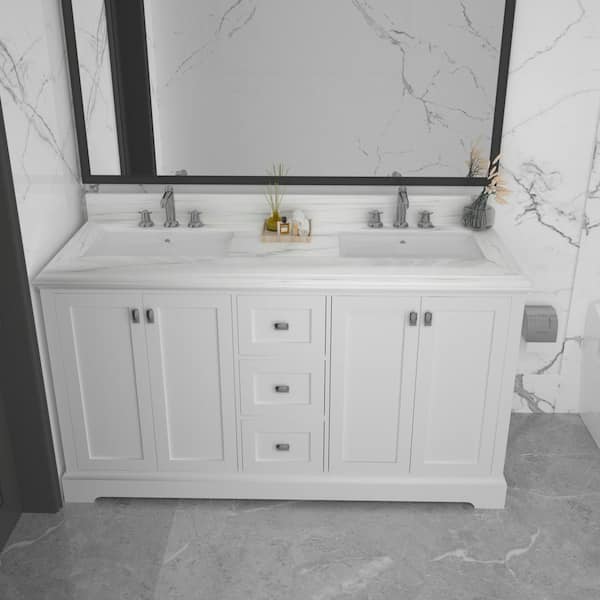 22.4 in. W x 60 in. H 2 Sink Bathroom Vanity Cabinet 3-Drawers and 2-Double Door Cabinets White Marble Countertop,White