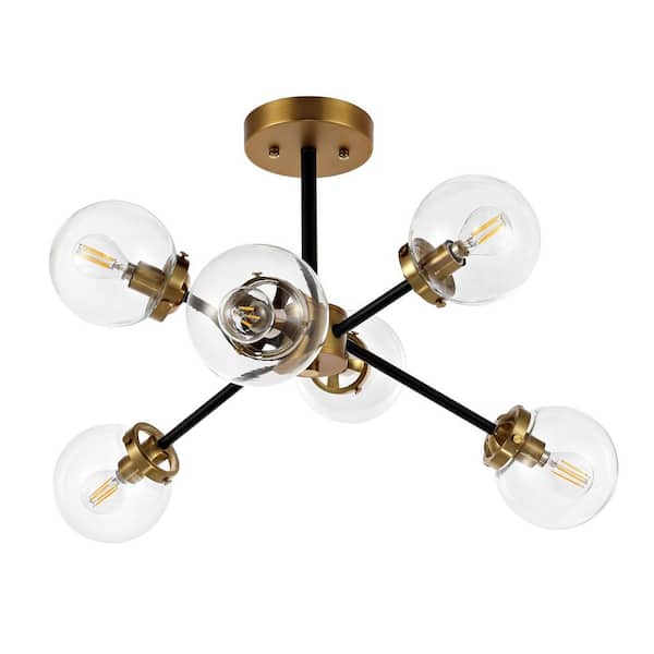 22.6 in. 6-Light Black Modern Semi-Flush Mount, Sputnik Pedant Light Fixture with Large Clear Glass Globe Shade