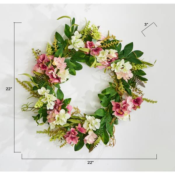 22 in. Artificial White Pink Hydrangea and Foliage Wreath