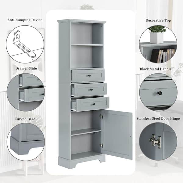 22 in. W x 10.03 in. D x 67.3 in. H Gray Linen Cabinet with 3 Drawers and Adjustable Shelves