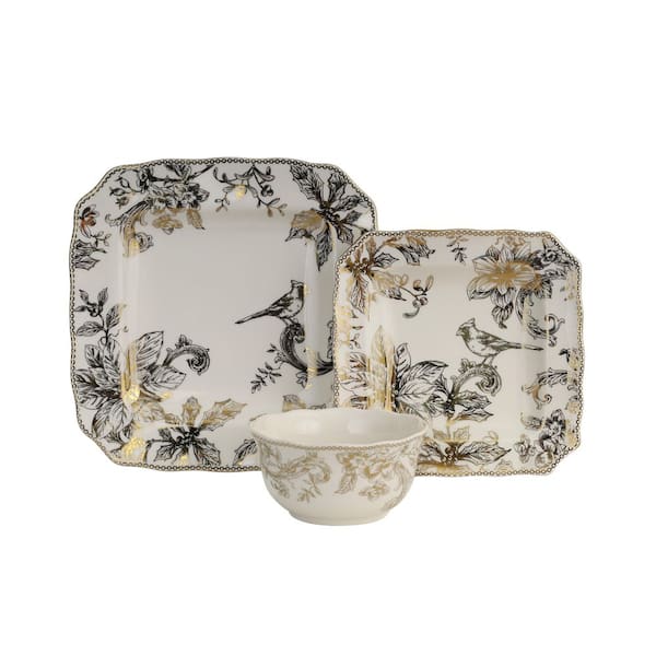 Christmas Lane Electroplate 12-Piece Dinnerware Set for 4, White/Gold Porcelain Dish Set