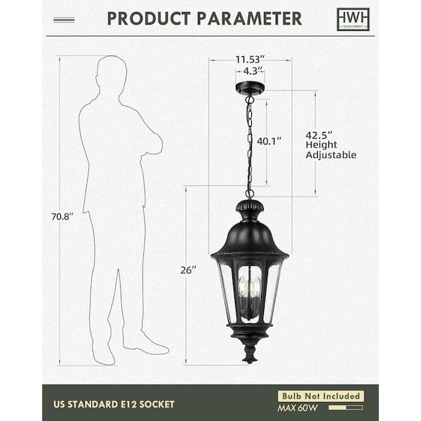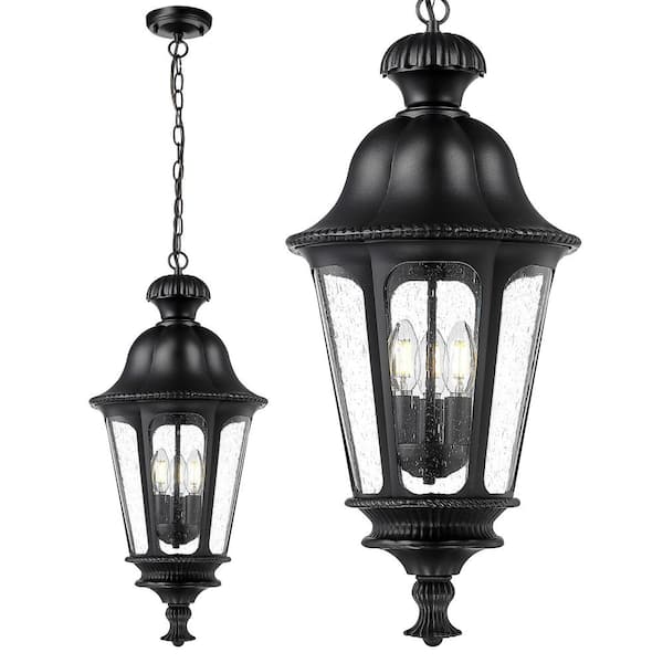 23 in. 3-light Black Outdoor Pendant Light with Seeded Glass and No Bulbs Included Hanging Chandelier for Porch Patio