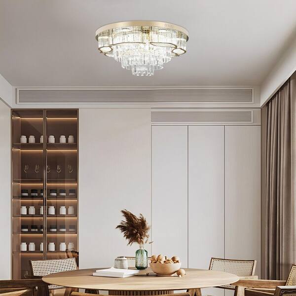 23 in. Gold Luxury Crystal Flush Mount Ceiling-Light with Clear Crystal Shade and Remote for Living Room Bedroom