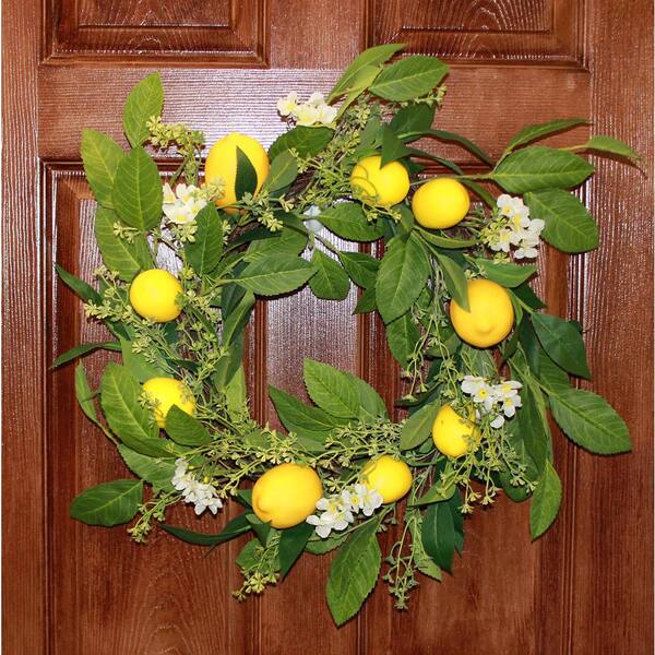 24 in. Artificial Lemon, Green Leaves and White Flowers Wreath