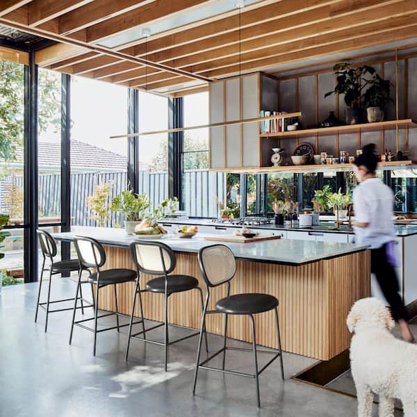 24 in. Black Rattan Metal Frame Wood Back Counter Height Bar Stools with Faux Leather Seat (set of 3)