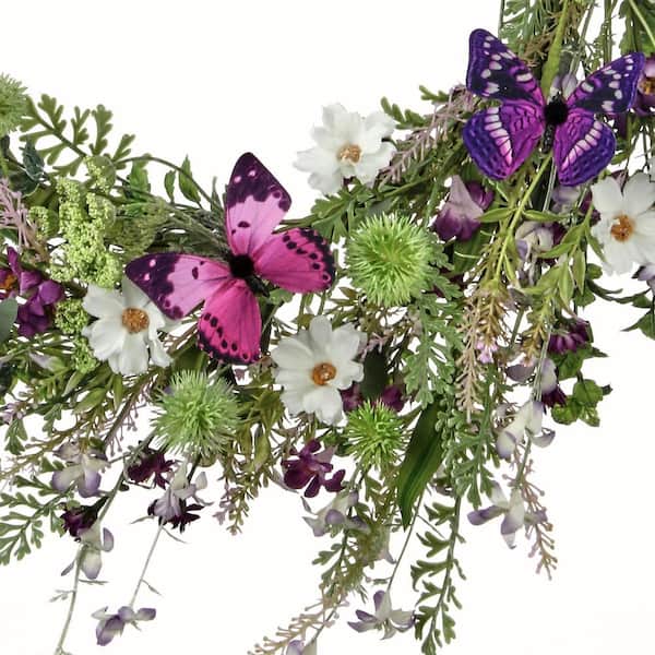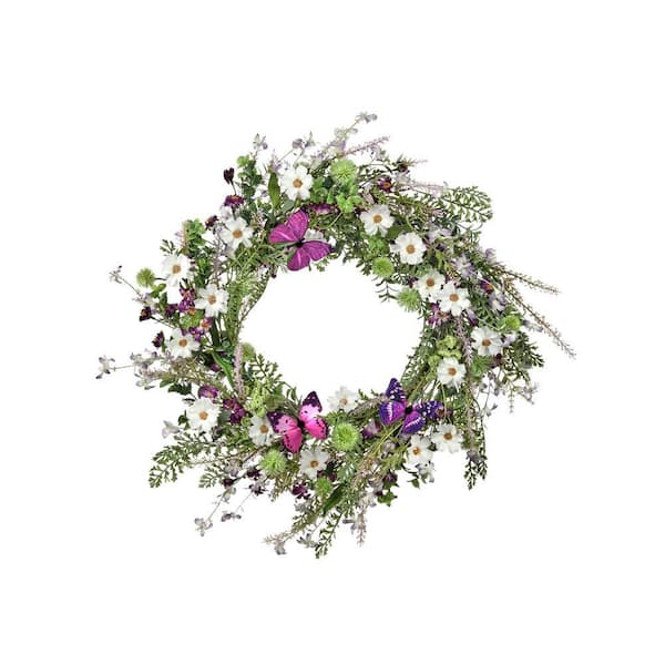 24 in. Purple, White Artificial Wildflower with Butterfly Wreath