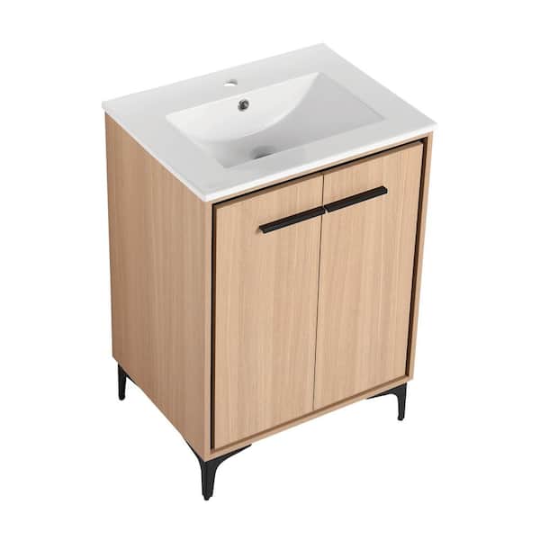 24 in. W x 18 in. D x 34 in. H Freestanding Bath Vanity in Brown With White Ceramic Basin Sink2-Doors Storage Cabinet