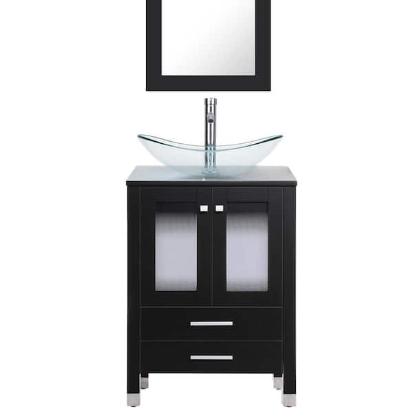 24 in. W x 20 in. D x 32 in. H Single Sink Bath Vanity in Black with Clear Glass Vessel Sink Top Chrome Faucet Set