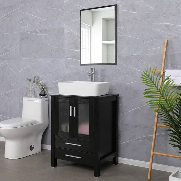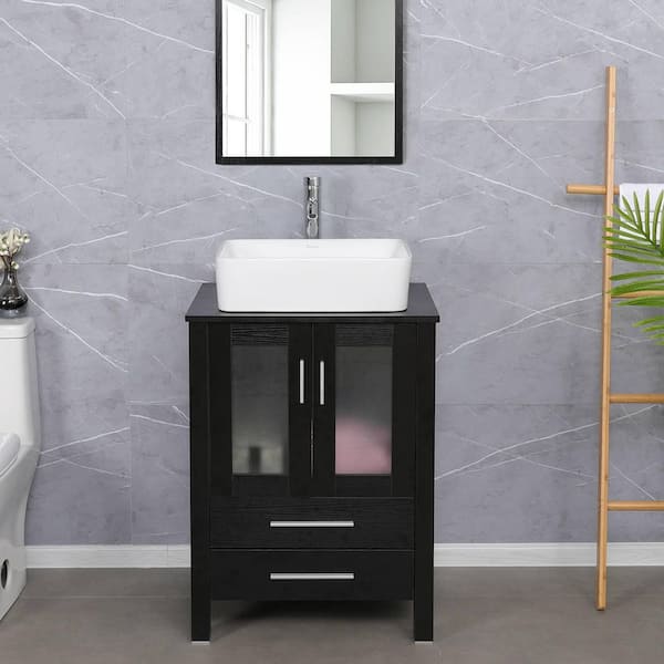 24 in. W x 20 in. D x 32 in. H Single Sink Bath Vanity in Black with White Ceramic Vessel Sink Top Chrome Faucet Set