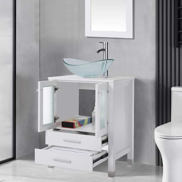 24 in. W x 20 in. D x 32 in. H Single Sink Bath Vanity in White with Clear Glass Vessel Sink Top Chrome Faucet