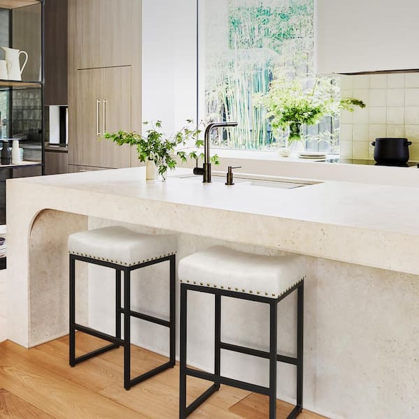 24 in. White Cusioned Backless Faux Leather Saddle Bar Stools with Metal Frame (Set of 4)