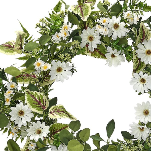 24 in. White, Green Artificial Daisy and Mix Greens Wreath 24 in.