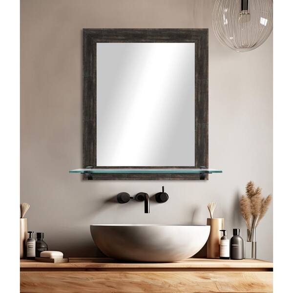 25.5 in W x 21.5 in H Rectangular Framed Brown Distressed Vertical Wall Mirror with Tempered Glass Shelf/Black Brackets