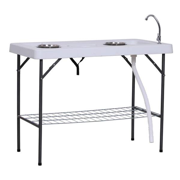 25.50 in. White Rectangle Steel Folding Picnic Tables, Fish Cleaning Table with Sink, Faucet, Camping Table