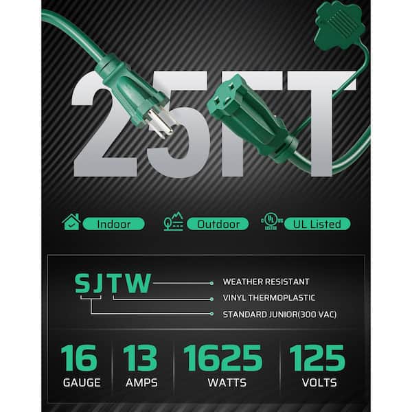 25 ft. 16/3C SJTW Outdoor Extension Cord with 3-Prong 3 Outlets and Safety Cover, Green
