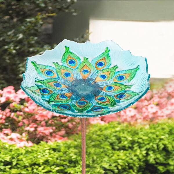 • Handmade glass birdbath bowl with a peacock pattern
