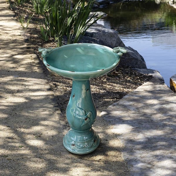25 in. H x 19 in. Dia Turquoise Ceramic Birdbath with 2 Bird Figurines