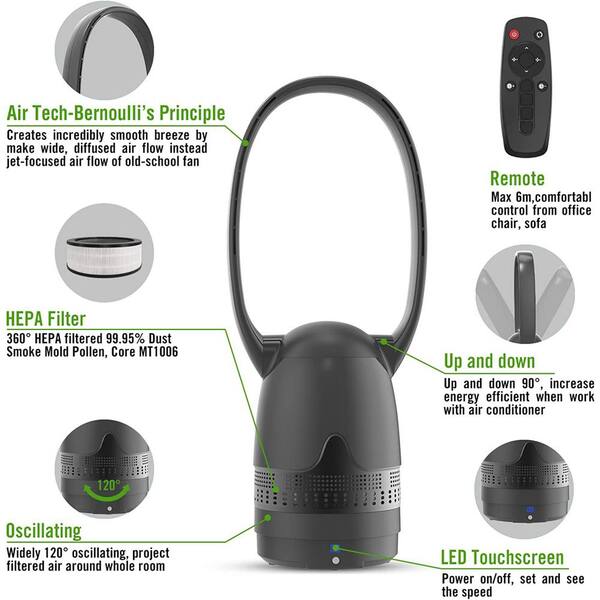 26 in. 3-Mode 8 fan speeds Bladeless Tower Fan in Black, Air Purifier Fan with H12 HEPA Filter and Remote Control