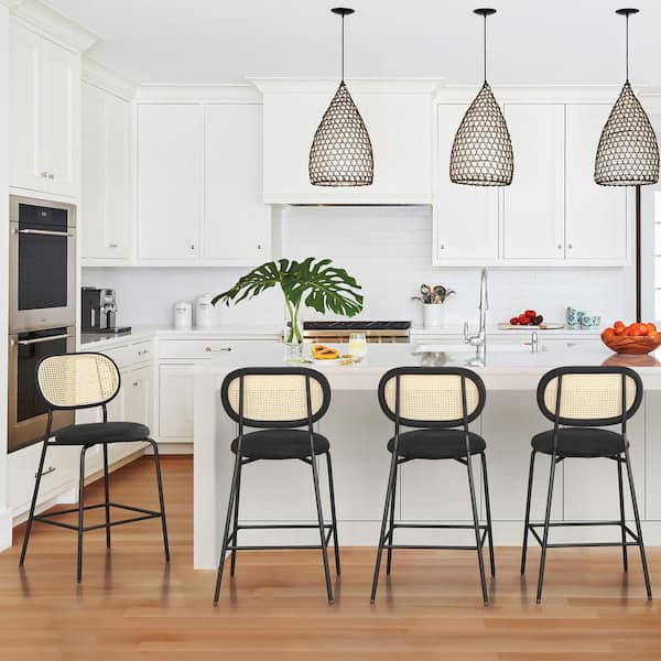 26 in. Black Metal Frame Rattan Counter Height Bar Stools With Faux Leather Seat (Set of 2)