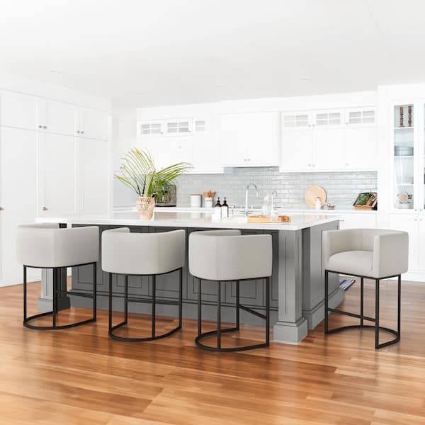 26 in.Cream-Grey and Black Low Back Bar Stool with Metal Frame Counter Height Linen Upholstered Counter Stool Set of 3