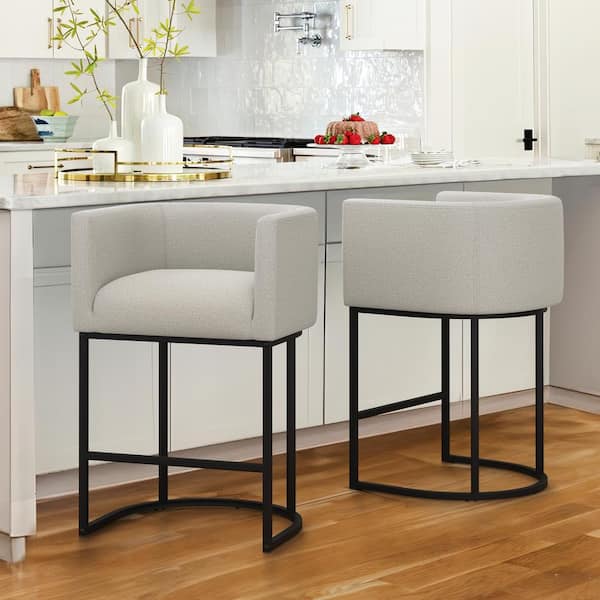 26 in.CreamGrey and Black Low Back Bar Stool with Metal Frame Counter Height Linen Upholstered Counter Stool Set of 6