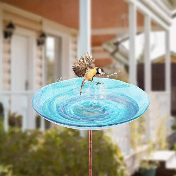 26 in. H x 11.4 in. Dia Blue Glass Birdbath with Metal Stake