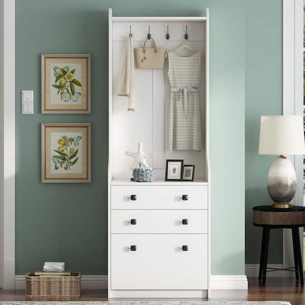 27.5 in. W Narrow Hall Tree with Flip Drawer with 4 Hanging Hooks and Drawers, Adjustable Shoe Storage Cabinet in White