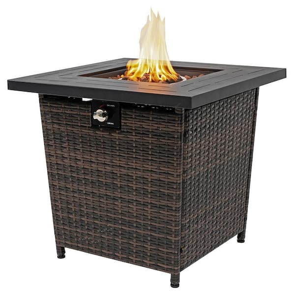 27 in. Brown Wicker Rattan Rectangular Propane Gas Fire Pit Table 40,000 BTU with Steel Lid and Laval Rocks