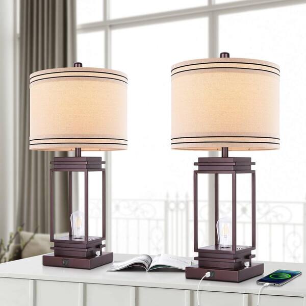 28 in. Brown Table Lamp Set ((Set of 2)) Dimmable Farmhouse Table Lamps with Shape and USB Ports