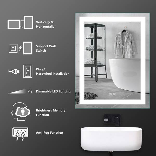 28 in. W x 36 in. H Rectangular Frameless LED Lighted Anti-Fog Wall Mounted Bathroom Vanity Mirror, Dual Switch System
