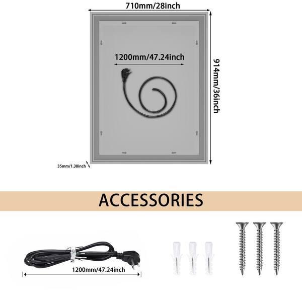 28 in. W x 36 in. H Rectangular Frameless LED Wall Mount Anti-Fog Modern Decorative Bathroom Vanity Mirror