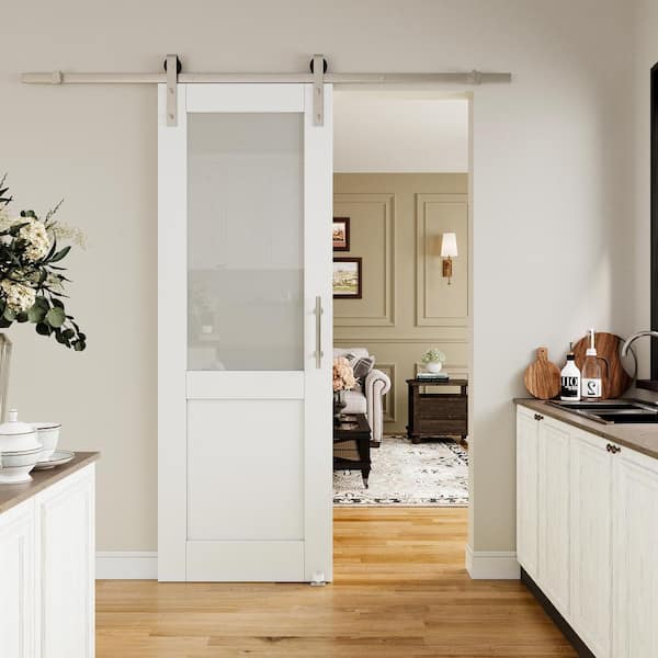 28 in. x 80 in. 1/2-Lite Tempered Frosted Glass White Primed MDF Sliding Barn Door with Hardware Kit Nickel Plat