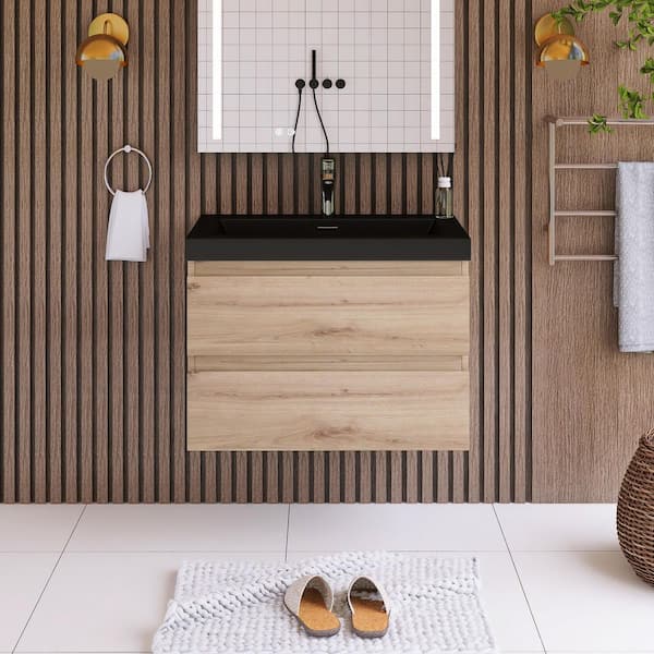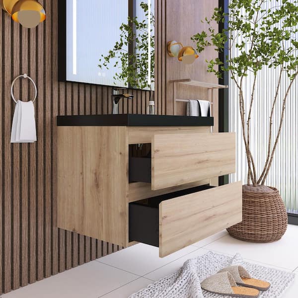 29.5 in. W x19.7 in. D x 22.5 in. H Single Sink Wall Mounted Bath Vanity in Natural Oak with Matte Black Quartz Sand Top