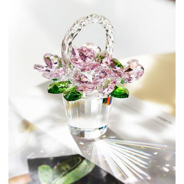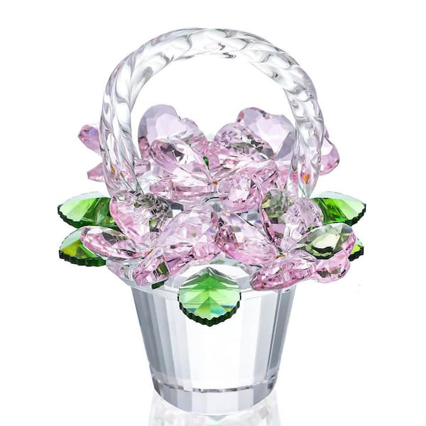 3.4 in Crystal Pink Flower Basket Figurine: Glass Collectible with 5 Flowers for Home, Wedding and Christmas Decor