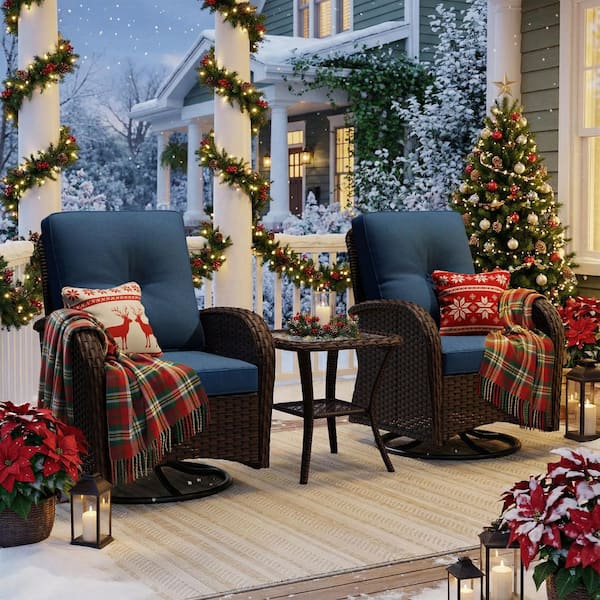 3-Pcs Dark Brown Wicker Outdoor Rocking Chair Patio Conversation Set Swivel Chairs with Blue Cushions and Table