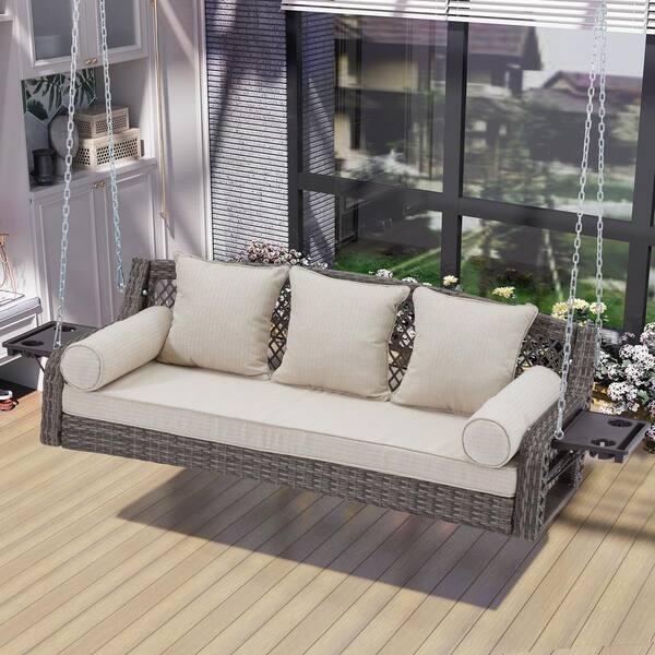 3-Person Gray Wicker Porch Swing with Beige Cushion and Cup Holders and Chains for Deck Garden Backyard