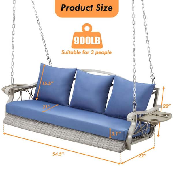 3-Person Heavy Duty 900 lbs. White Wicker Outdoor Patio Swing with Light Blue Cushions and Cup-Holder
