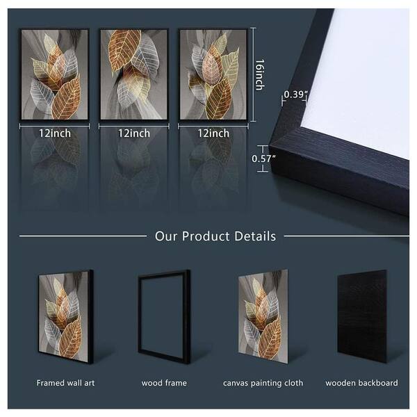 3-Piece 12 x 16 in. Black Framed Abstract Leaves Canvas Wall Art for Home Decor