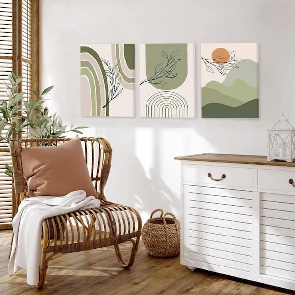 3-Piece 12x16 in. Unframed Sage Green Boho Wall Art Set - Geometric Leaf and Sun Canvas for Home Decor