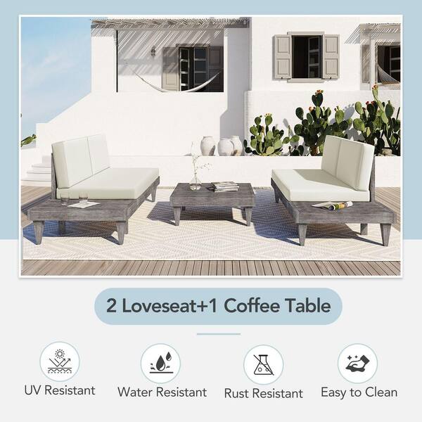 3-Piece Acacia Wood Outdoor Patio Sectional Sofa Seating Conversation Sets with Beige Cushions and Side Table