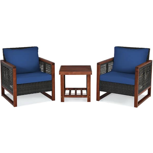 3-Piece Acacia Wood Patio Conversation Set with Square Wooden Table Hallow Wicker and Blue Cushions