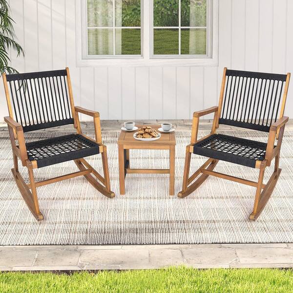 3-Piece Acacia Wood Rocking Chair Set with Coffee Table and All-Weather Rope Patio Conversation Poolside