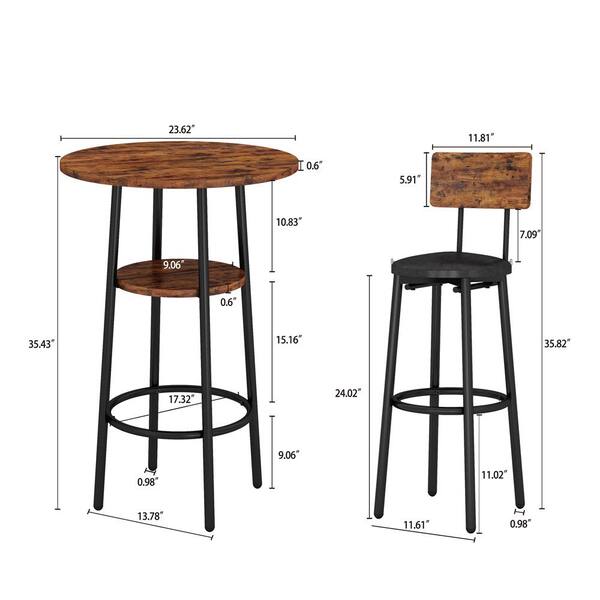 3-Piece Antique Espresso Double Layer Wood Round Outdoor Serving Bar Set with 2 Black PU Cushion Bar Stools