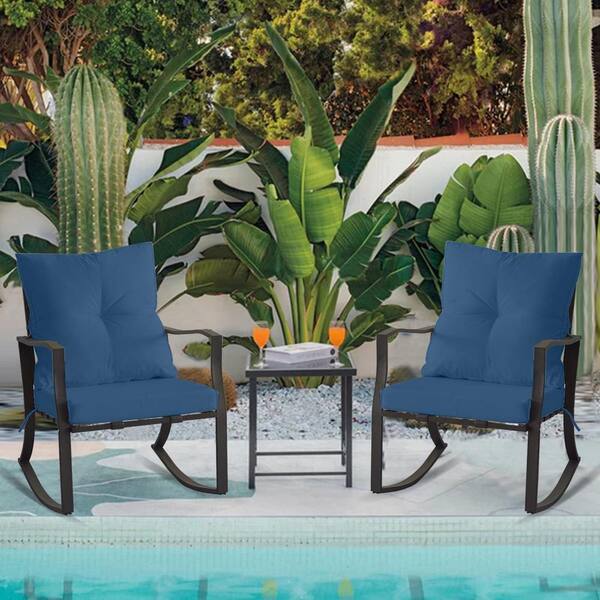 3-Piece Black Metal Patio Conversation Set with Blue Cushions with Glass Coffee Table
